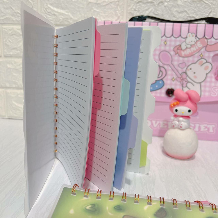 صحافی سیمی دفتر با فنر فلزی به هم متصل شده است که صفحات را بهراحتی باز و بسته میکند.