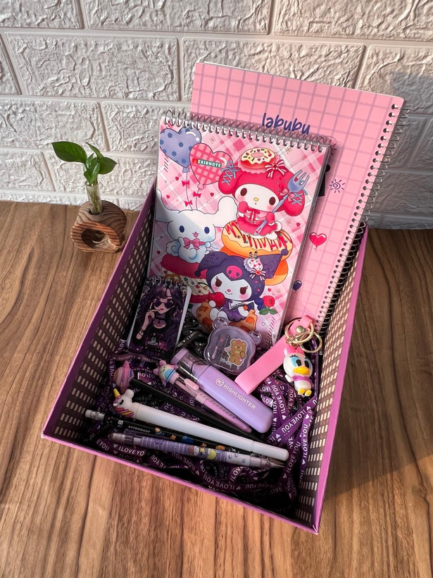 این پک با رنگبندی صورتی و طراحی فانتزی، ظاهری بسیار شیک، لطیف و دخترونه داره و داخلش معمولاً مجموعهای از لوازم کاربردی و فانتزی قرار میگیره؛ مثل لوازم تحریر، اکسسوری، آیتمهای تزئینی یا وسایل کوچیک جذاب (بسته به مدل فروشگاه).